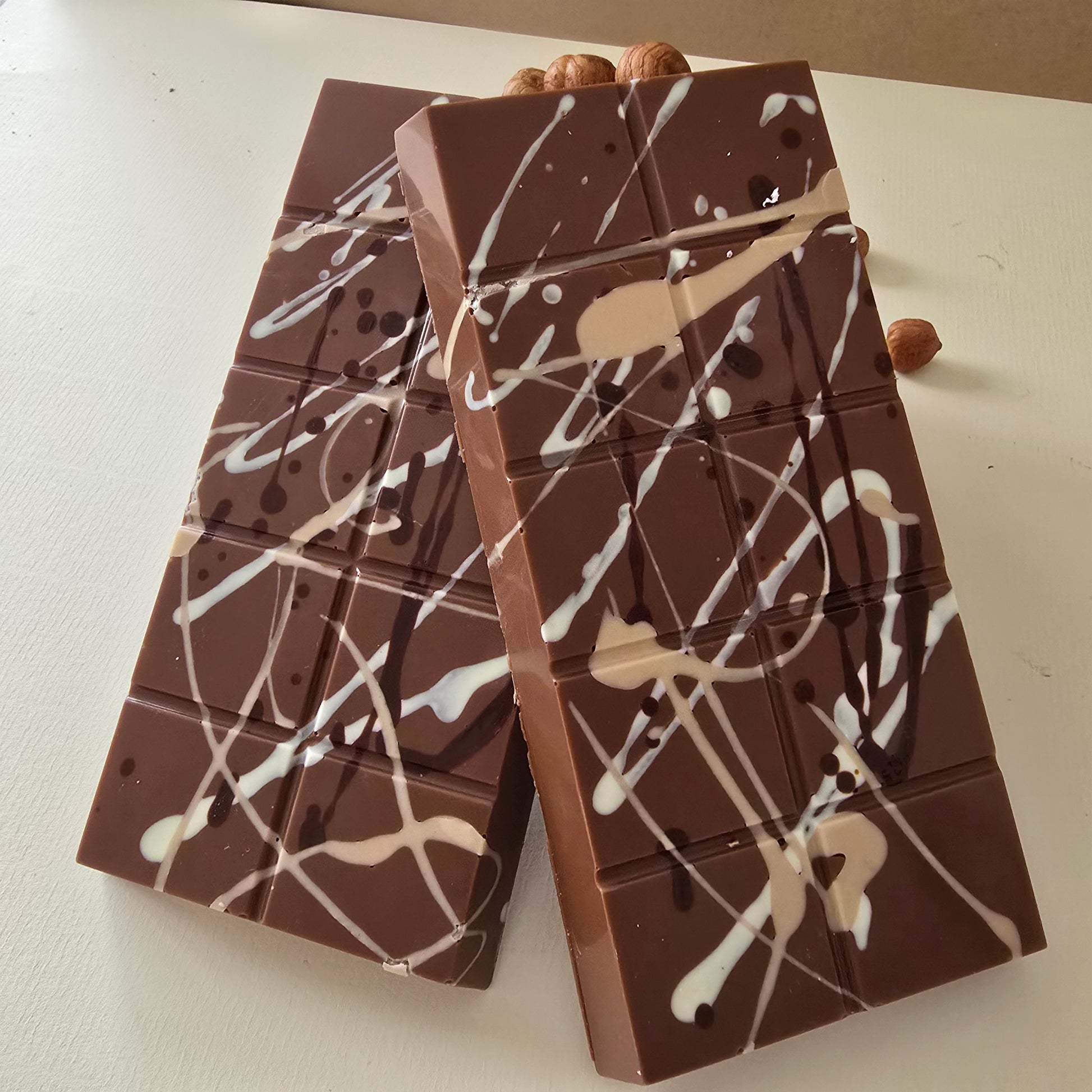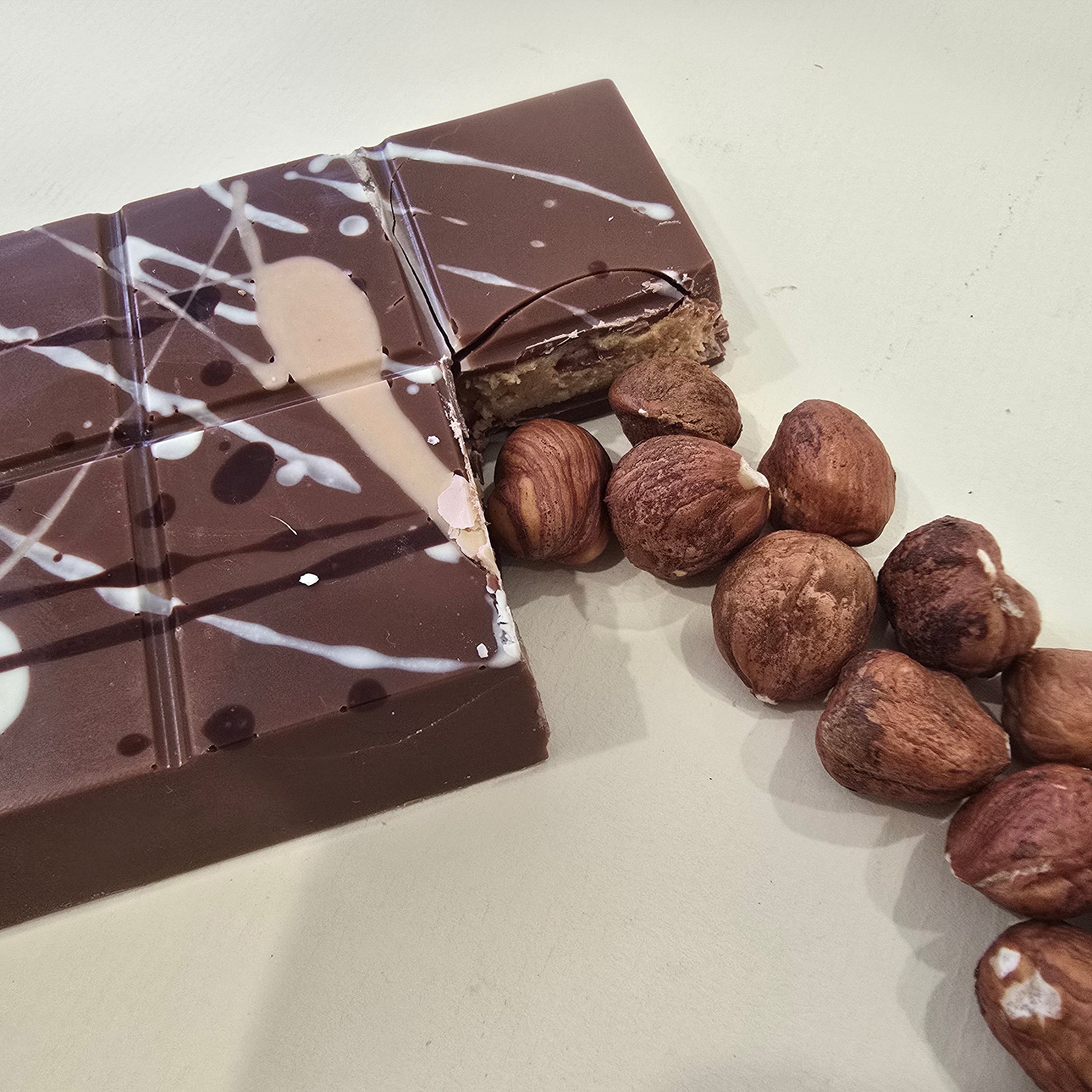🌰 Plongez dans l'extase gourmande avec notre nouvelle tablette de chocolat au lait fourrée à la noisette. Imaginez une couche de chocolat au lait onctueux qui fond délicatement en bouche, révélant un cœur généreux de crème de noisette, suave et infiniment fondante.